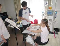 ホスピーグループ内では新生会第一病院において、腹膜透析の導入と管理を行っています。在宅透析教育センターの看護師が教育訓練を行っています。腹膜透析は一定期間実施すると、腹膜機能の低下から腹膜透析の維持が困難となり、血液透析に移行する必要があります。当院の腹膜透析の特徴の一つとして、腹膜透析中止後、在宅血液透析への移行を行い、在宅透析治療を継続する治療選択ができることが挙げられます。